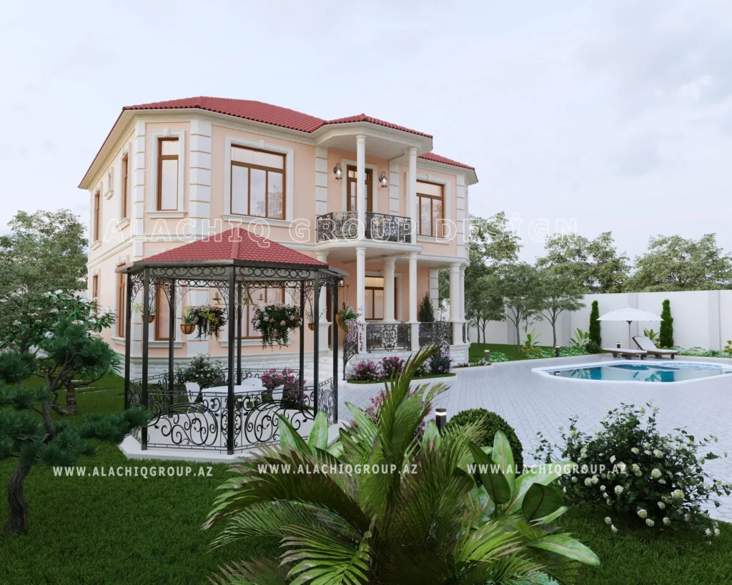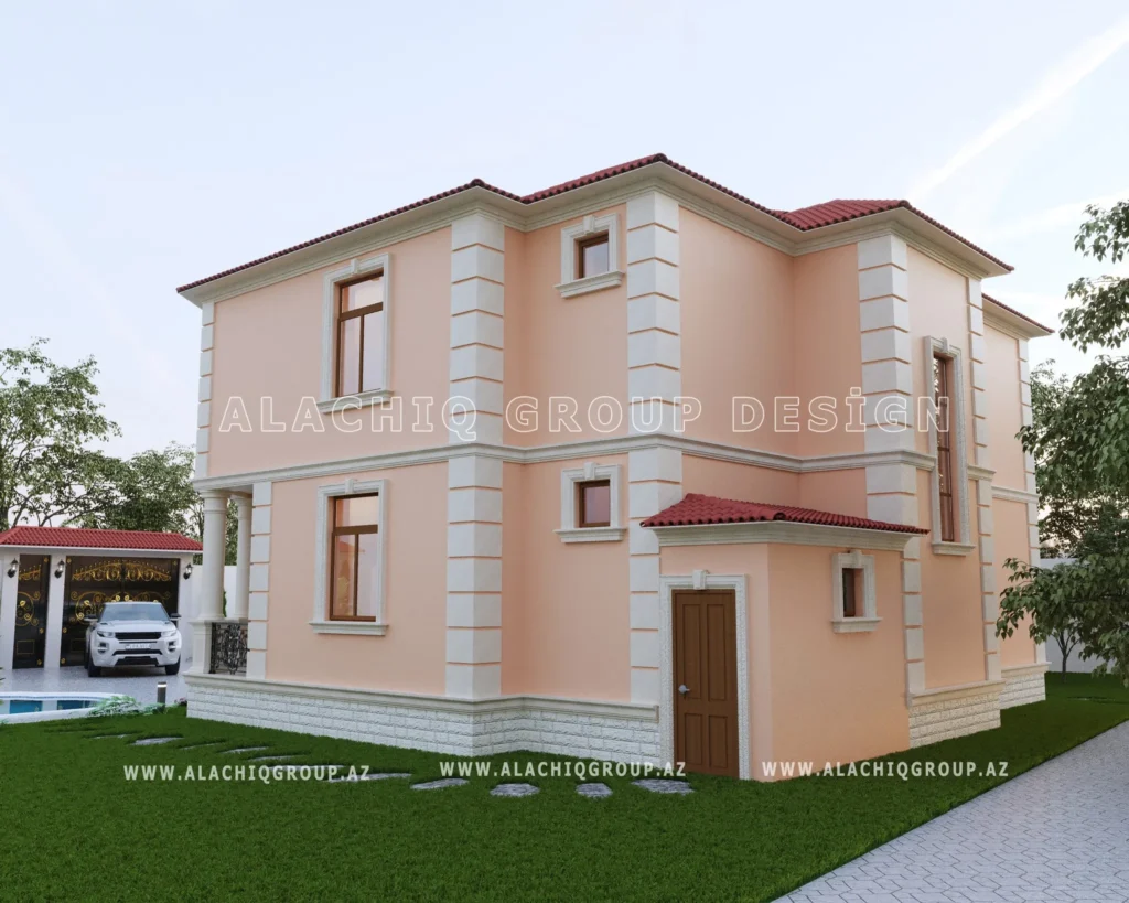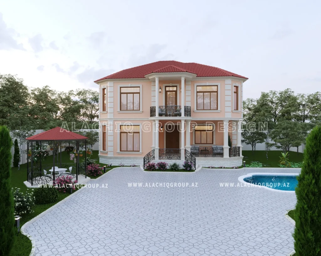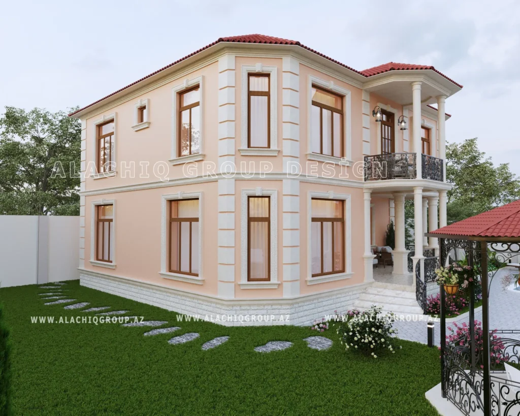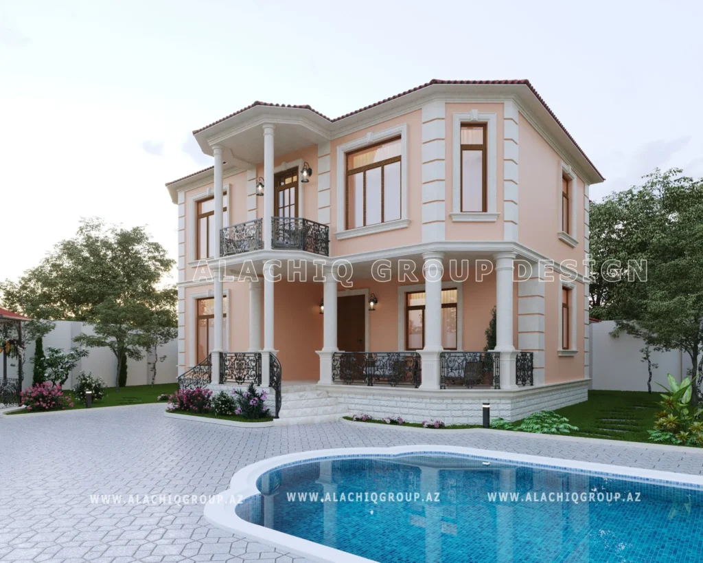 İki mərtəbəli fasad, zərif sütunlar və dekorativ elementlər evinizə aristokratik bir aura qatır.